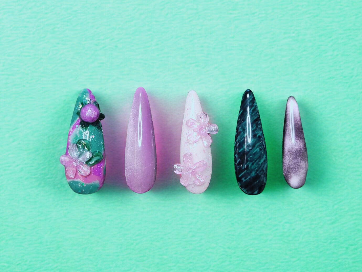 Indulge in the art of surprise with a bespoke hand-painted nail set! Each set is a unique expression of creativity—crafted with elegance, detail, and a hint of the unexpected. Each set is a fun, unique mix of styles and colours, perfect for those who love a little excitement and variety. Switch up your look in minutes without any fuss - if you dare!
