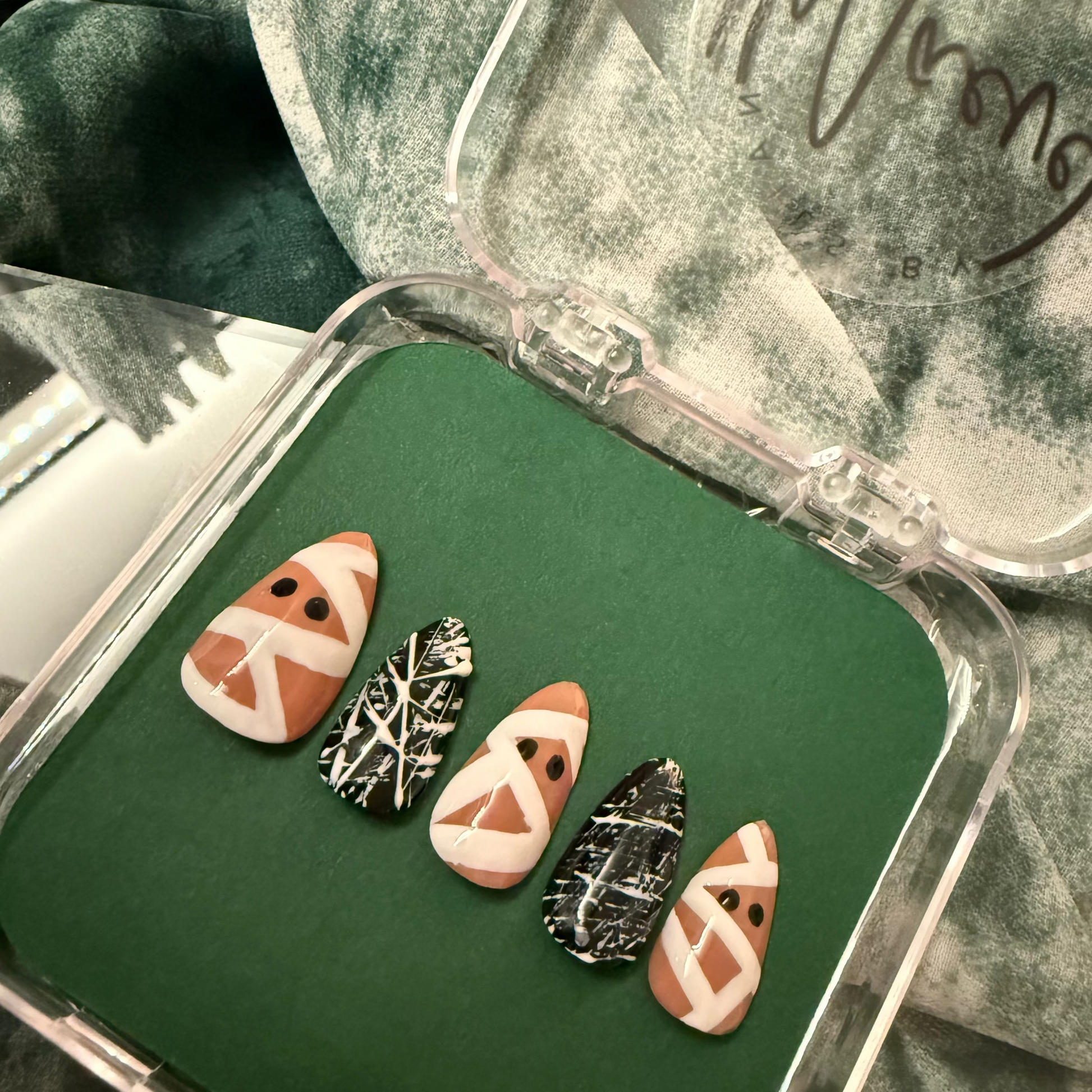 Wrap your nails in mystery and charm with "Under Wraps!" This playful nail design blends mummified textures with gorgeous style, perfect for making a bold statement.